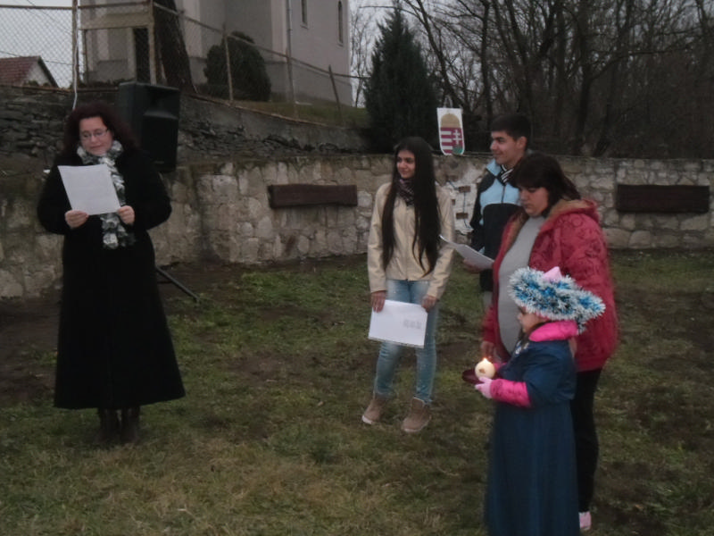 A gyertya meggyújtása után két adventi verset hallgathatott meg a közönség, helyi iskolás gyermekek előadásában.