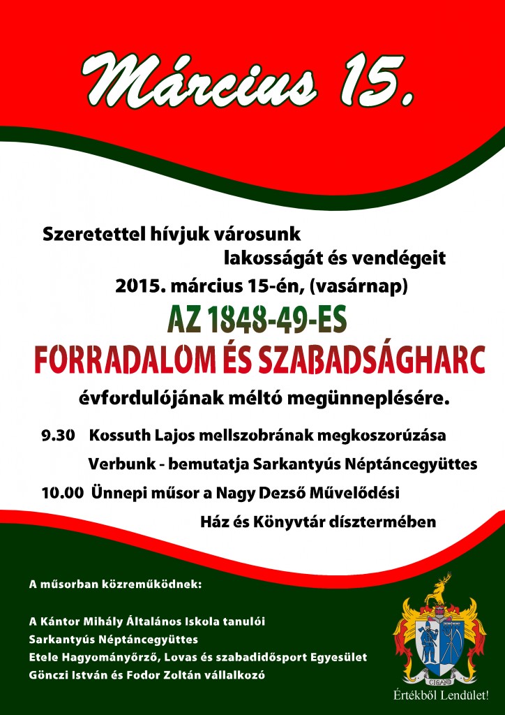 Szeretettel hívjuk városunk lakosságát és vendégeit 2015. március 15-én (vasárnap)az 1848-49-es forradalom és szabadságharc évfordulójának méltó megünneplésére.