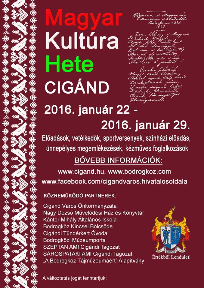 A Magyar Kultúra Hete programsorozatot immáron harmadik alkalommal hozta létre Cigánd Város Önkormányzata, a település oktatási és közművelődési intézményei, civil szervezetei.